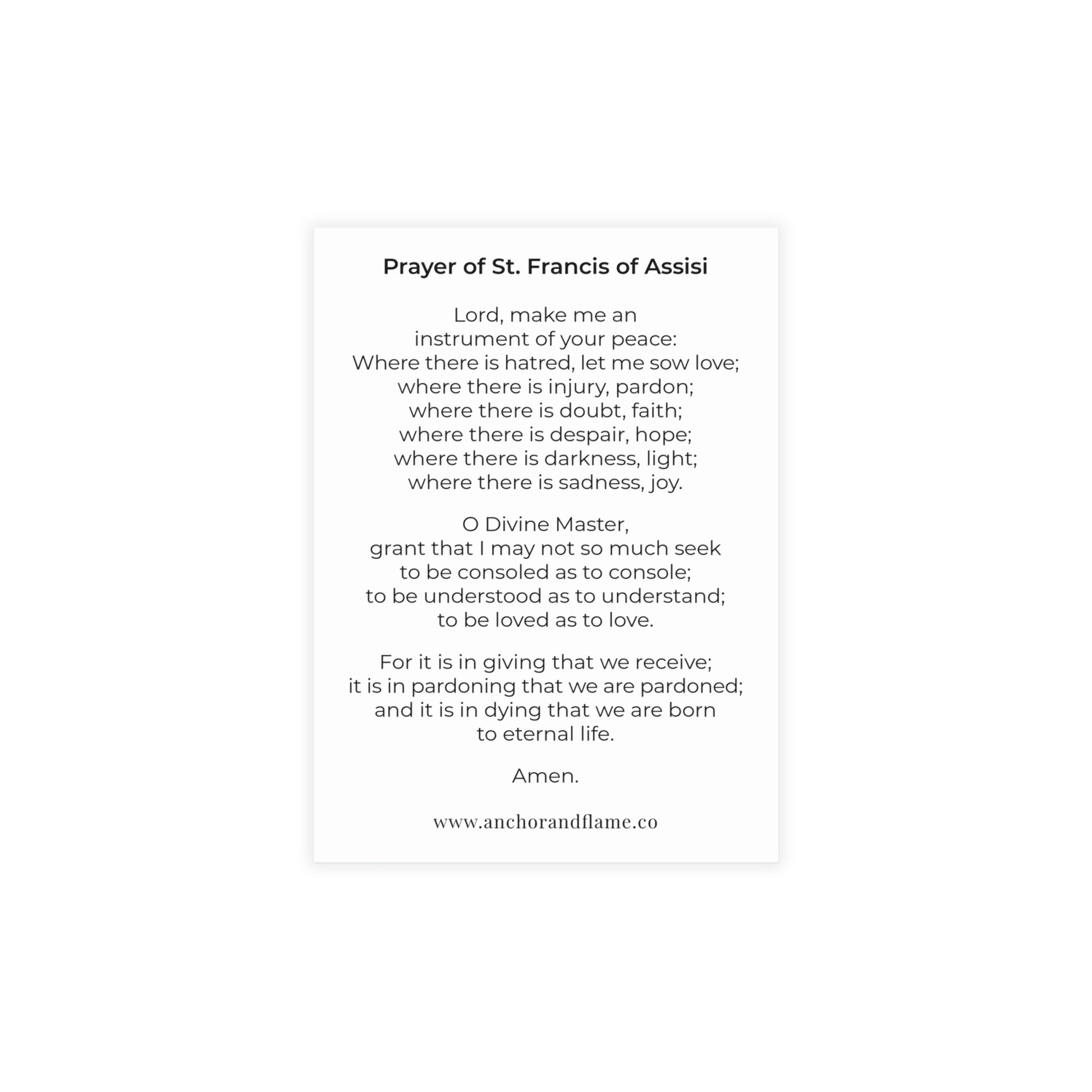 On the reverse side is the timeless Prayer of St. Francis—a heartfelt invocation to become an instrument of peace, love, and forgiveness. Known worldwide and cherished by Christians of every generation, this prayer is a powerful reminder of Christ’s call to live with charity, hope, and self-giving love.