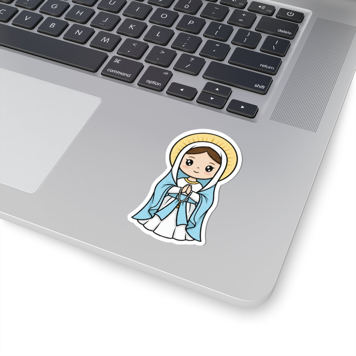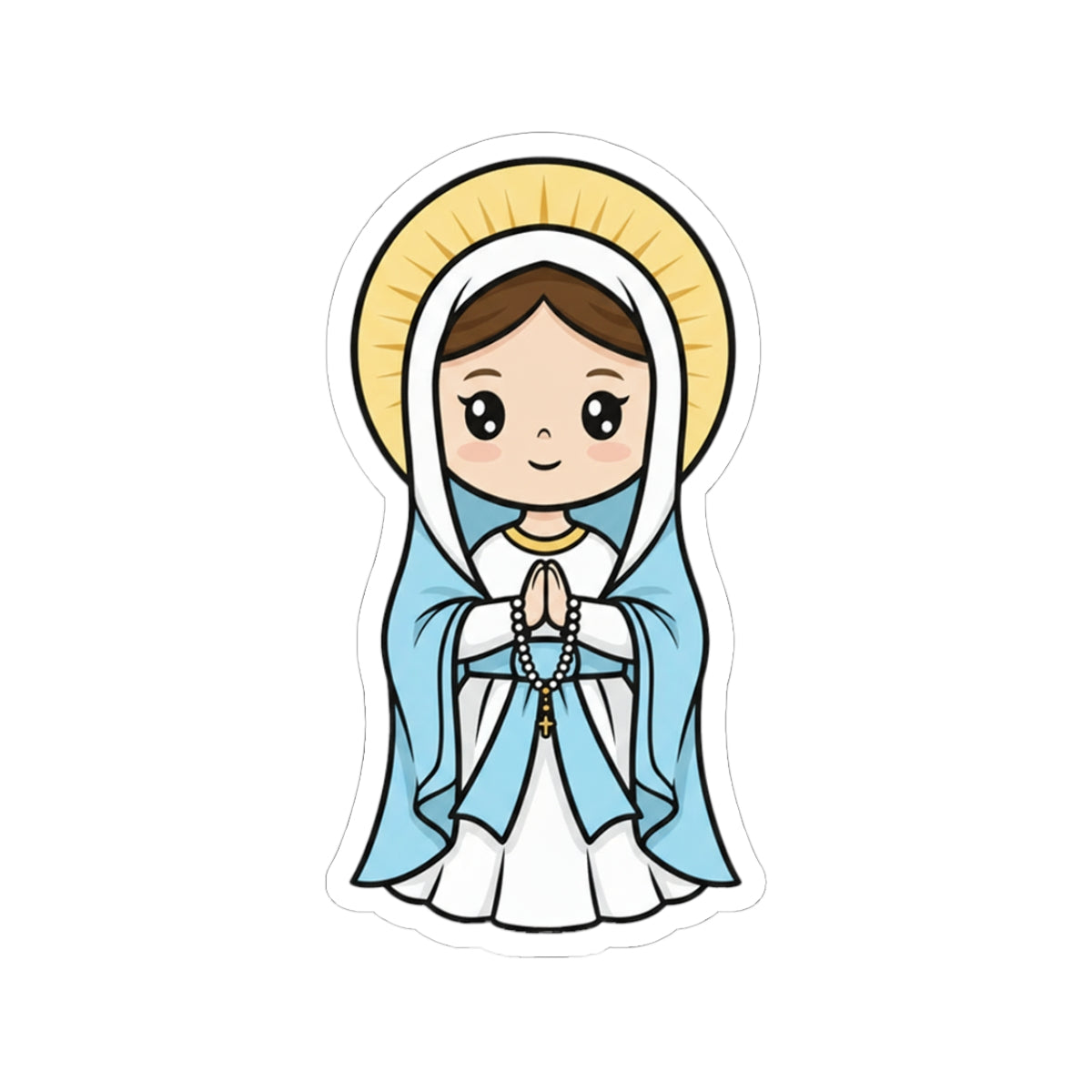 This sweet Chibi sticker of Our Lady of Lourdes shows Mary clothed in her flowing white gown with a pastel blue sash, holding a simplified rosary with folded hands. Her oversized head and big, bright eyes radiate gentle compassion, while her golden halo glows softly behind her. This playful sticker captures the tender, approachable love of Mary while keeping her beauty simple and charming.