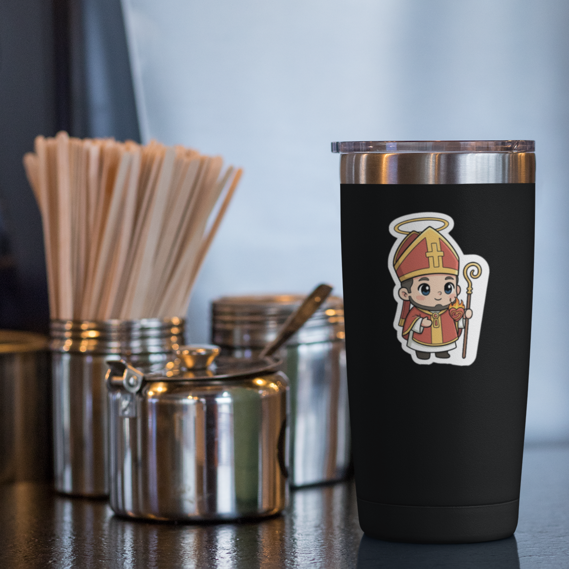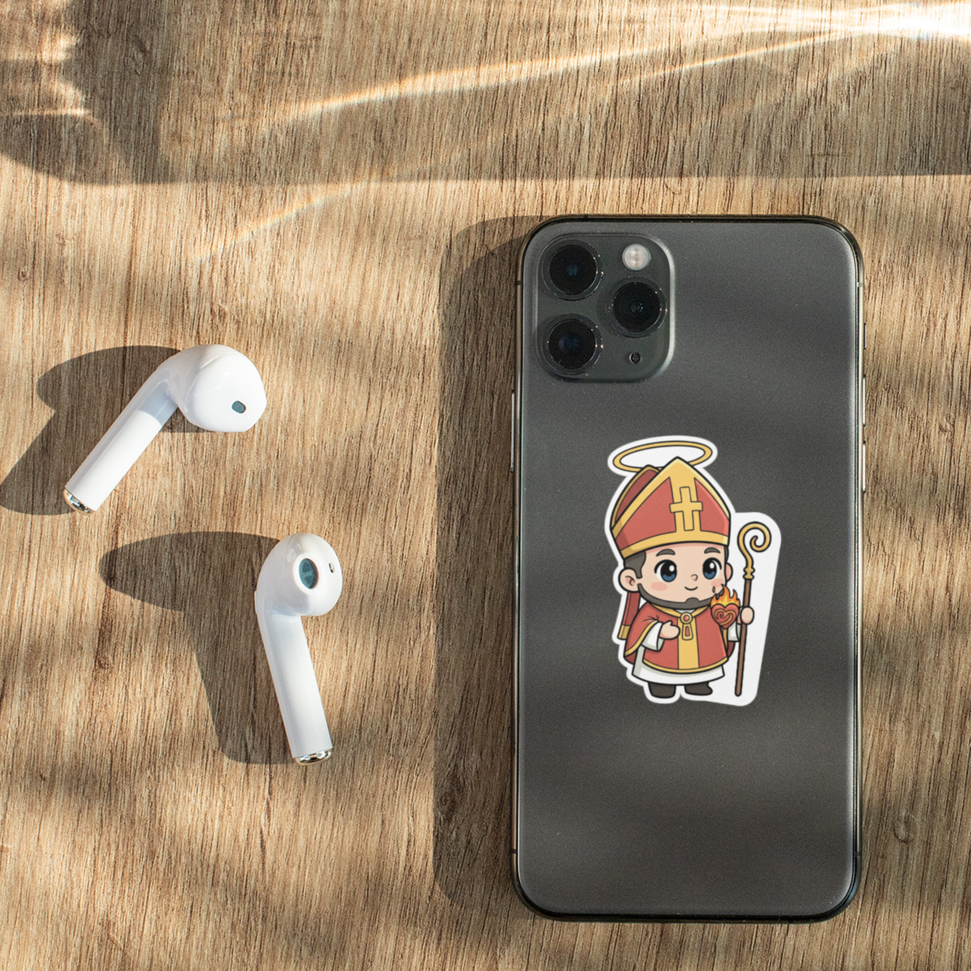 This delightful Chibi sticker of St. Augustine shows the bishop in simplified red-and-gold vestments with oversized head, joyful eyes, and a playful mitre. He holds a simplified glowing heart, symbolizing his love for God, making this sticker a fun yet meaningful way to celebrate his wisdom.