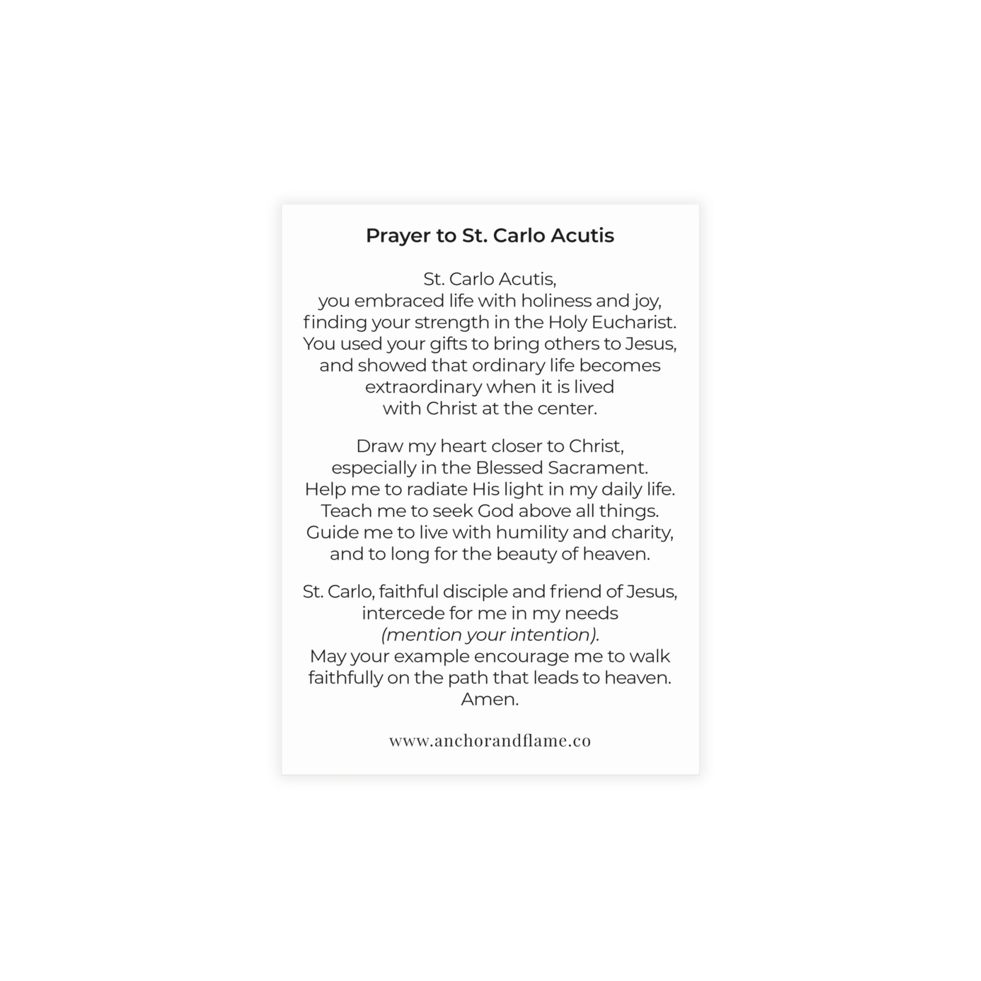 Draw closer to the inspiring witness of St. Carlo Acutis with this beautifully crafted 3.5" x 5" prayer card. Canonized in 2025 as the first millennial saint, Carlo is remembered for his joyful spirit, love for technology to spread the Gospel, and above all, his deep devotion to the Eucharist—his "highway to heaven."