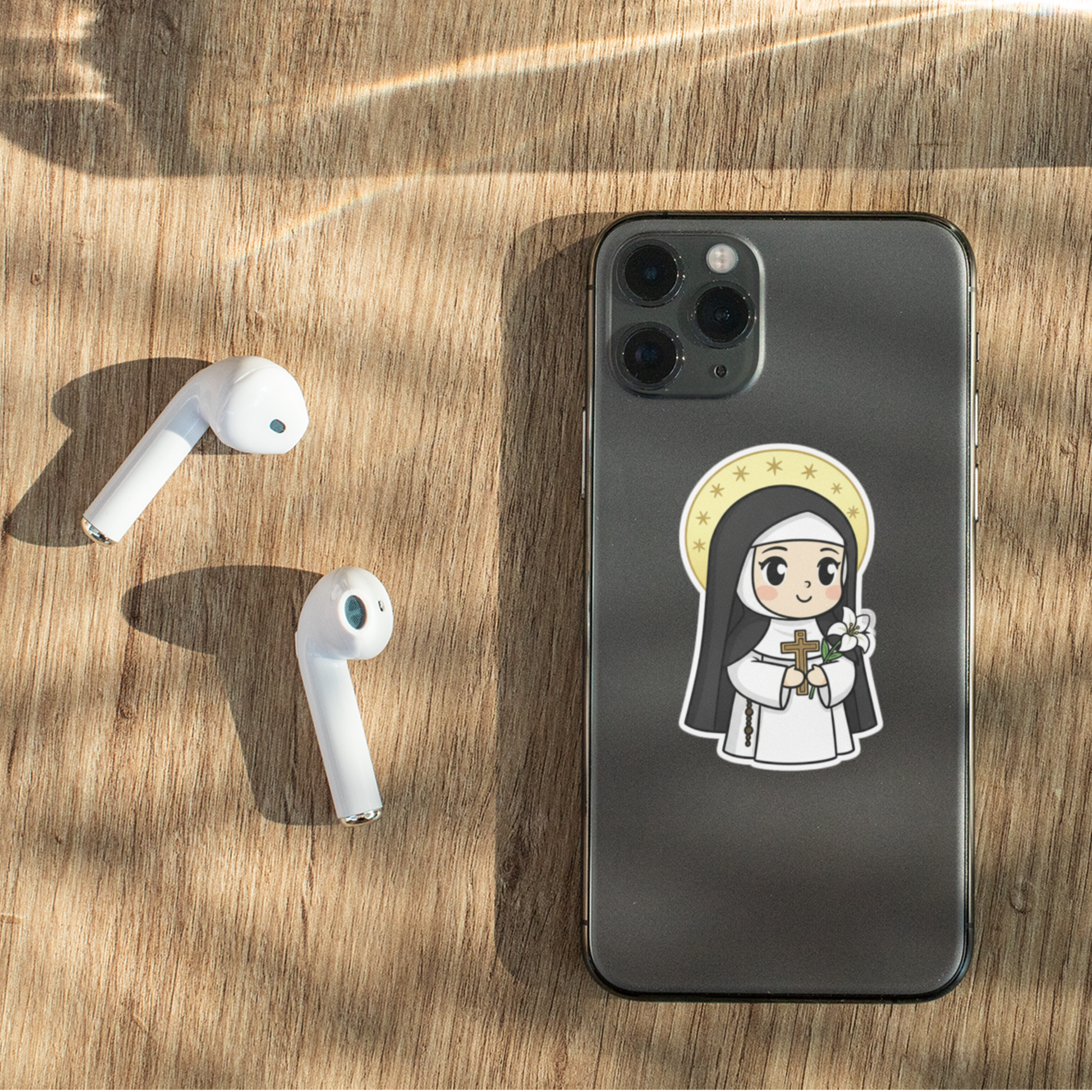 This Chibi sticker of St. Catherine of Siena shows her in the black-and-white Dominican habit with oversized head, expressive eyes, and pastel details. She holds a simplified crucifix or lily, symbolizing her purity and devotion. With a golden halo and playful proportions, this sticker blends reverence and charm.