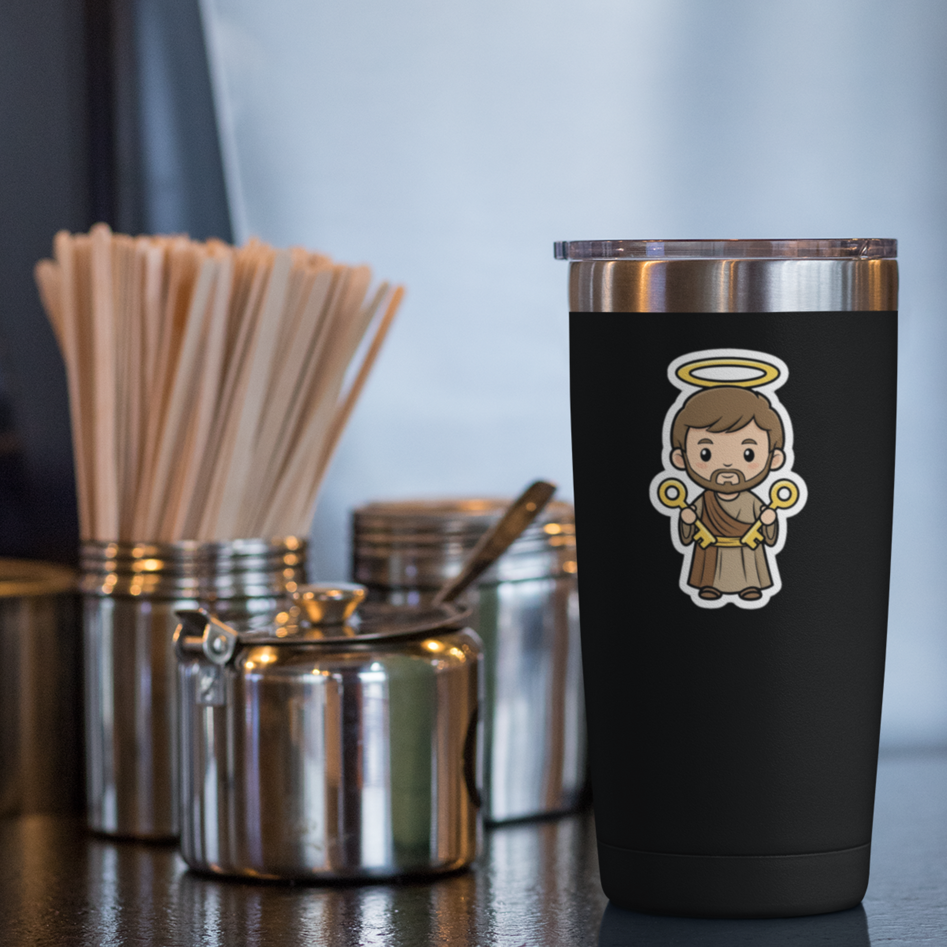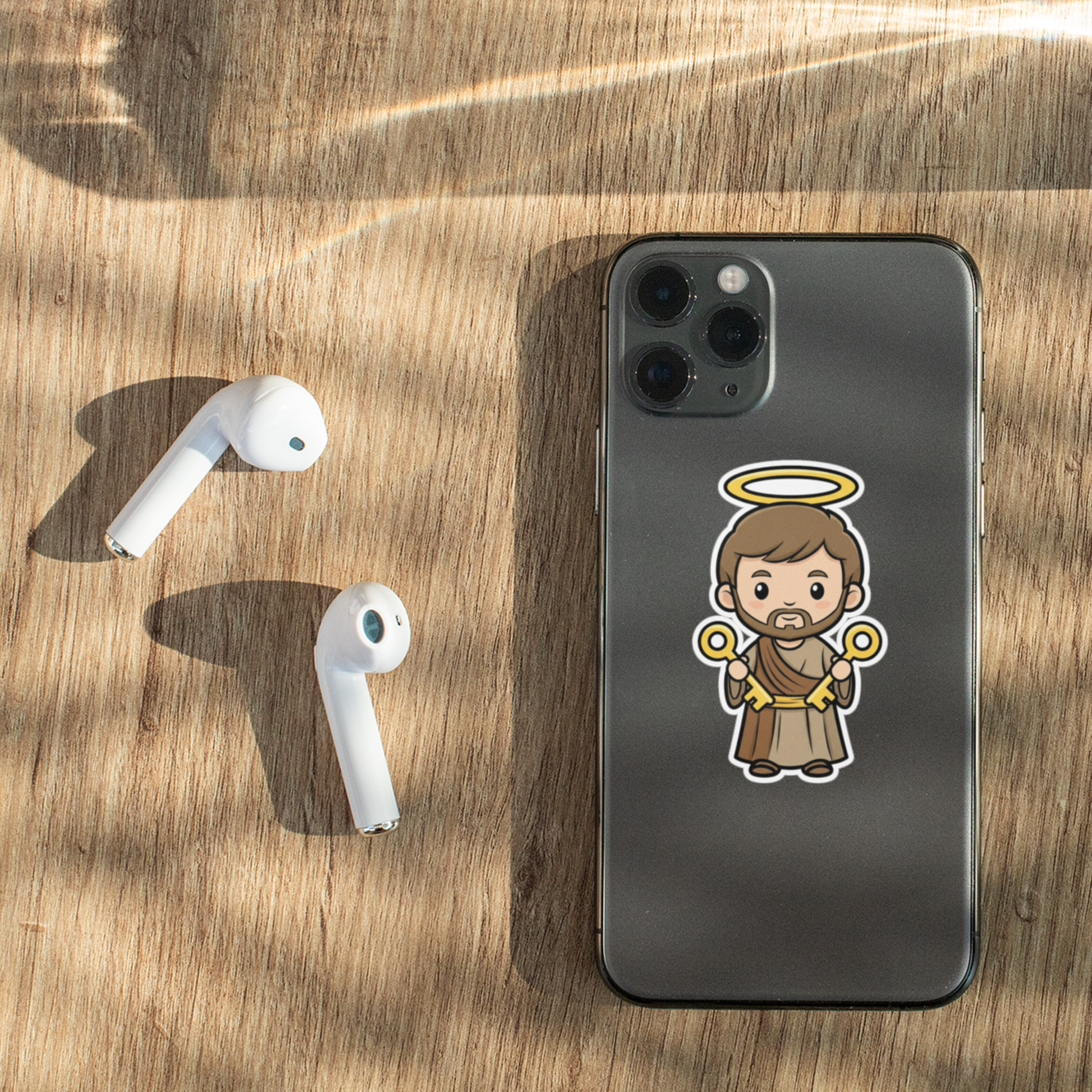 Celebrate the first pope with this Chibi-style sticker of St. Peter. He appears in earth-toned robes with an oversized head, bright eyes, and simplified golden keys in hand. Playful proportions and a glowing halo make this sticker both charming and inspiring—a fun reminder of faith and leadership.
