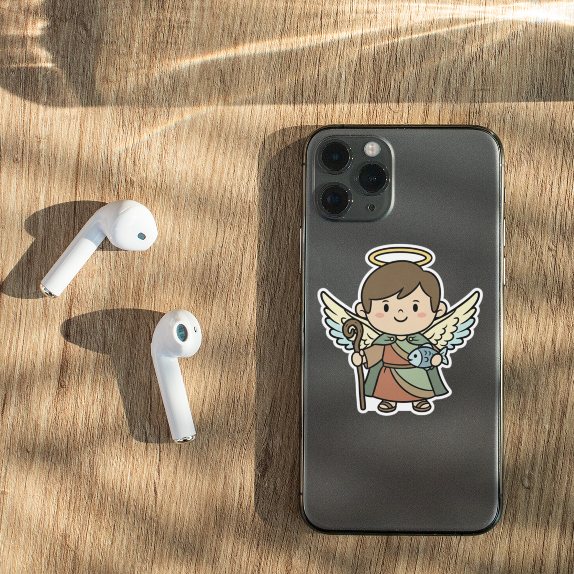 Bring the healing archangel into your collection with this Chibi sticker of St. Raphael. Shown in earthy pastel robes with an oversized head and joyful smile, he carries a small staff and a cartoon-style fish, referencing his role in the Book of Tobit. His golden halo and playful proportions make him both fun and inspiring.