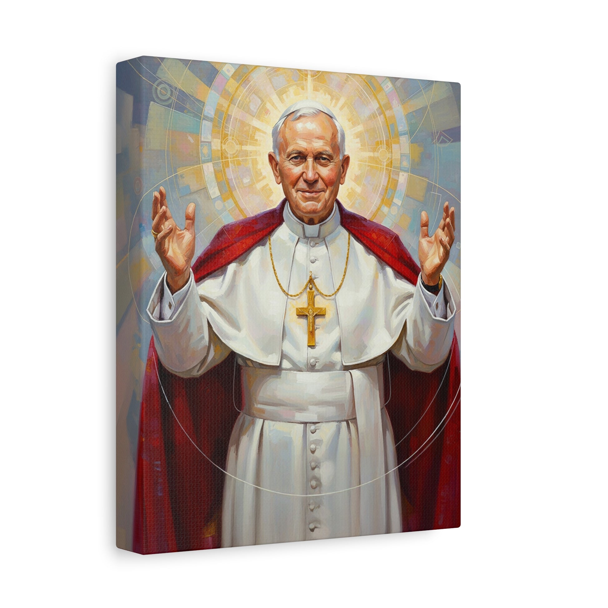 Celebrate the legacy of St. John Paul II, the beloved pope and saint whose life inspired millions to “open wide the doors to Christ.” This luminous stretched canvas captures his warmth, compassion, and holiness in a modern sacred art style.